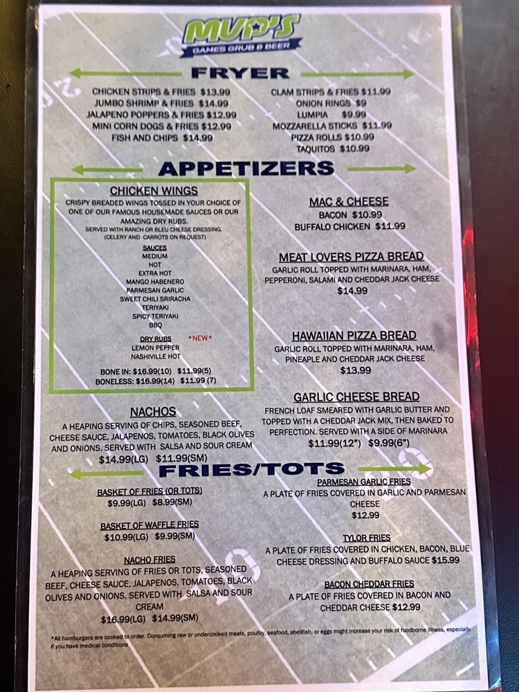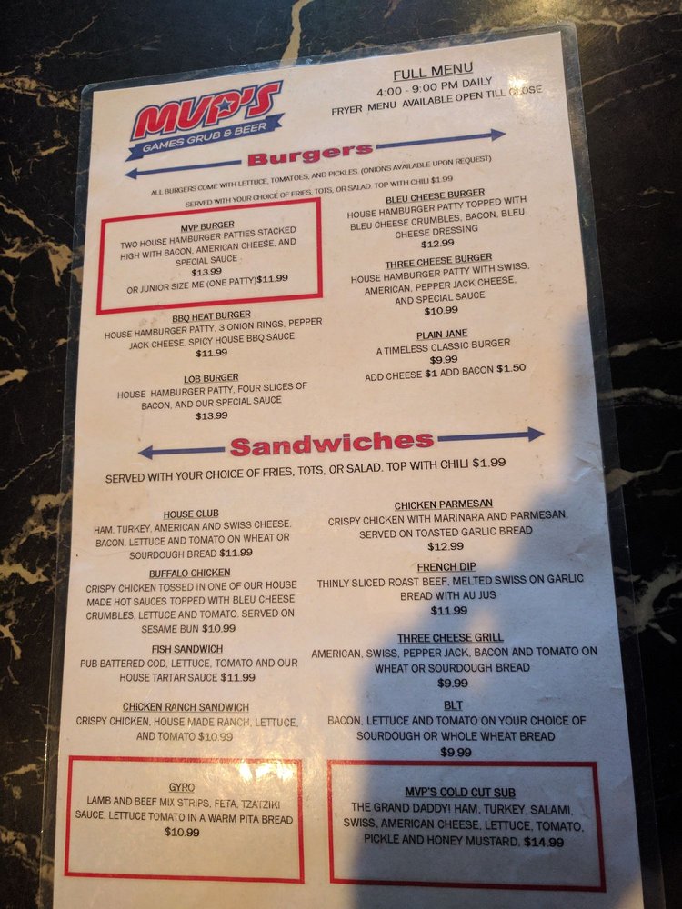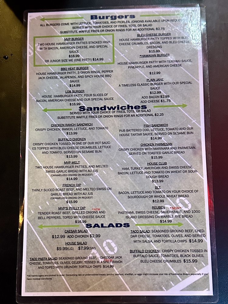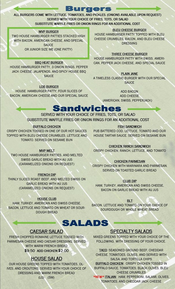 The burger selection boasts options like the MVP Burger, stacked with bacon and special sauce, or the tangy BBQ Heat Burger. Each dish is crafted to satisfy cravings while pairing perfectly with the engaging ambiance and attentive service. Come by to experience flavors that will make you feel right at home!